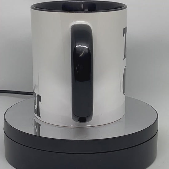 The Rodfather mug, white ceramic mug with black inner and handle with Tudor pictured.